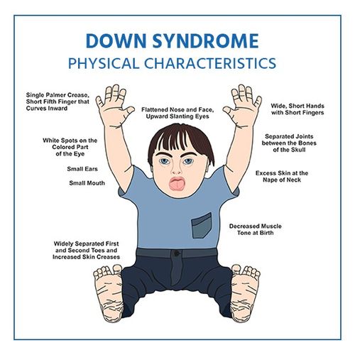 Бодит үзлэгээр хэл аманд багтахгүй томорсон, шилэн хүзүүндээ хунирал бүхий илүүдэл арьстай, булчингийн хүч сул (hypotonia) буюу Морогийн рефлекс сул. Өсөлт болон жингийн хоцрогдолтой байдаг. Зүрхний гажиг >50%-д тохиолддог.